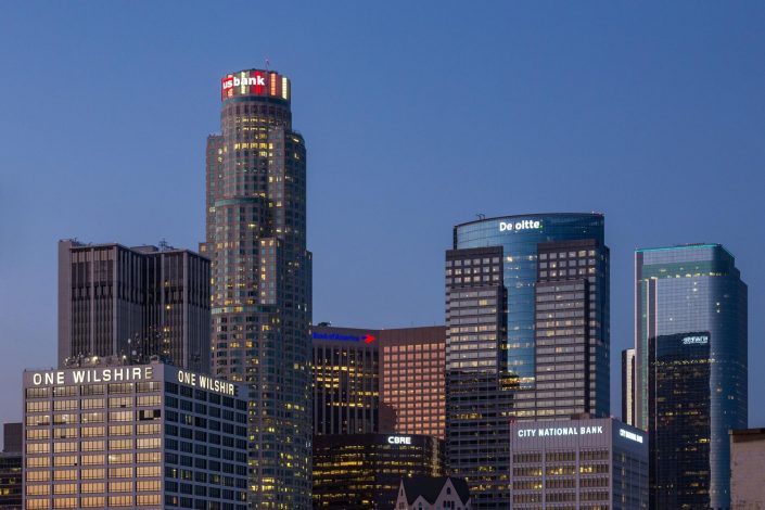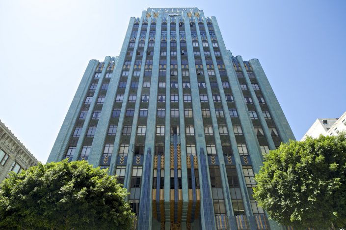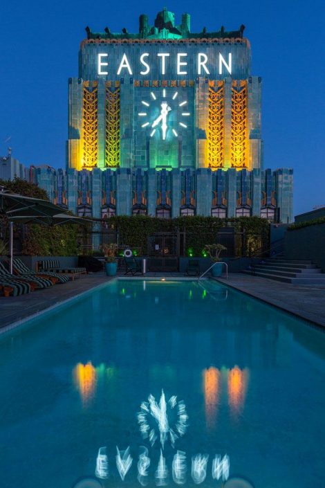 The edifice is easily spotted from the Interstate 10 – Santa Monica Freeway, as well as many other sections of downtown, due to its bright “melting turquoise” terra cotta tiles and trademark four-sided clock tower, emblazoned with the word “EASTERN” in bright white neon on each face of the clock.